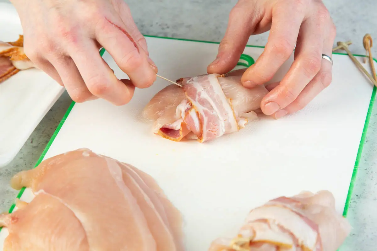 Повторите со всеми кусочками курицы, при необходимости скрепляя рулетики при помощи шпажек или зубочисток. Разогрейте духовку до 180-190 °C и запеките рулетики до готовности, примерно 20 минут.