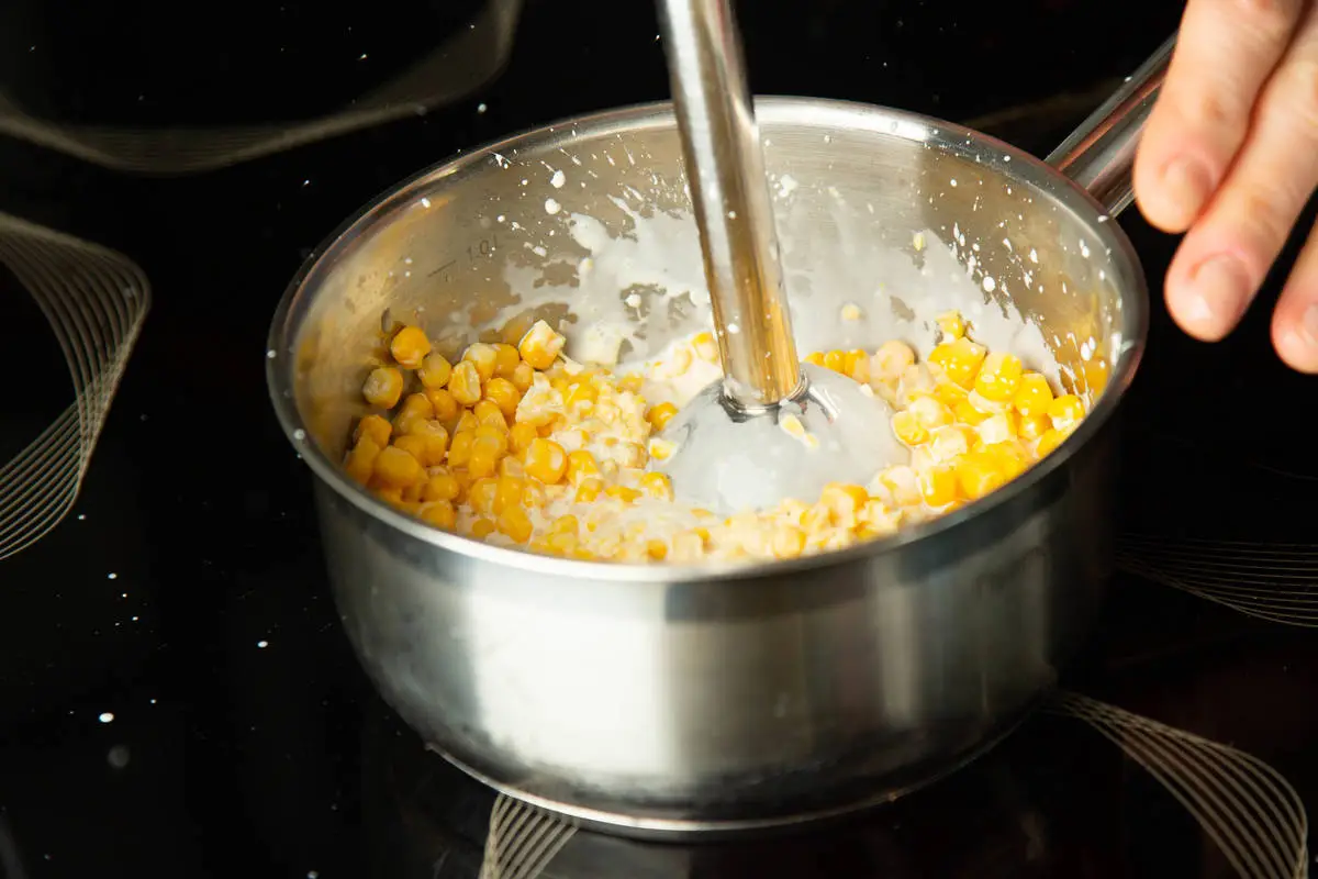 Подготовьте гарнир — кукурузу подогрейте вместе со сливками и слегка пробейте в блендере, не до однородности, просто чтобы слегка раздавить зёрна.