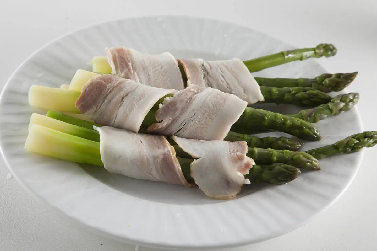 Бланшируйте спаржу в кипящей воде около минуты, затем сразу ополосните ледяной водой. Собирайте по 2-3 побега вместе и оборачивайте беконом так, чтобы получились рулеты.