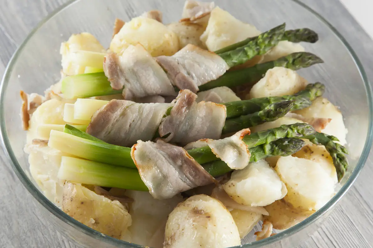 Попробуйте объединить нежную спаржу с рассыпчатым молодым картофелем в одном блюде, бекон добавит весомости этому сочетанию и обогатит вкус овощей.