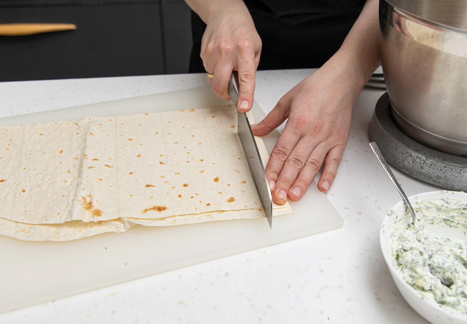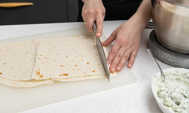 Лаваш нарежьте полосками толщиной, равной диаметру кружочков салями.