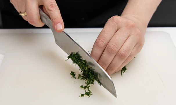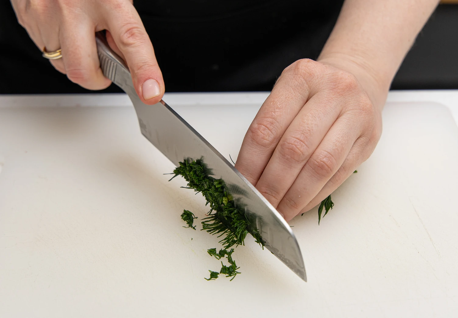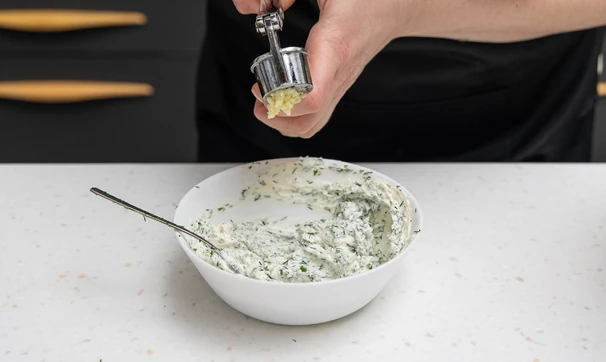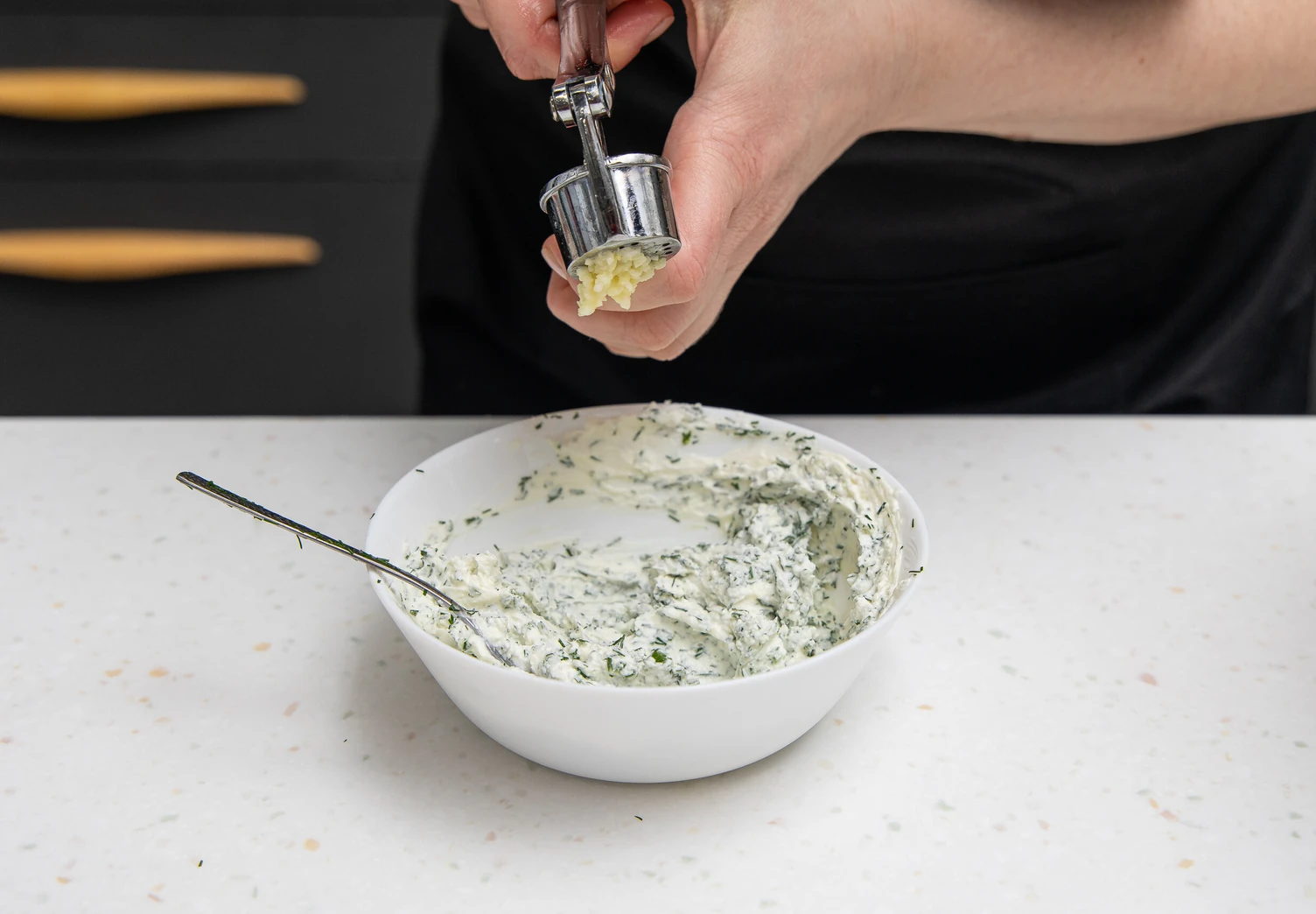 Соедините творожный сыр с укропом. Зубчики чеснока пропустите через пресс и перемешайте до получения однородной массы.