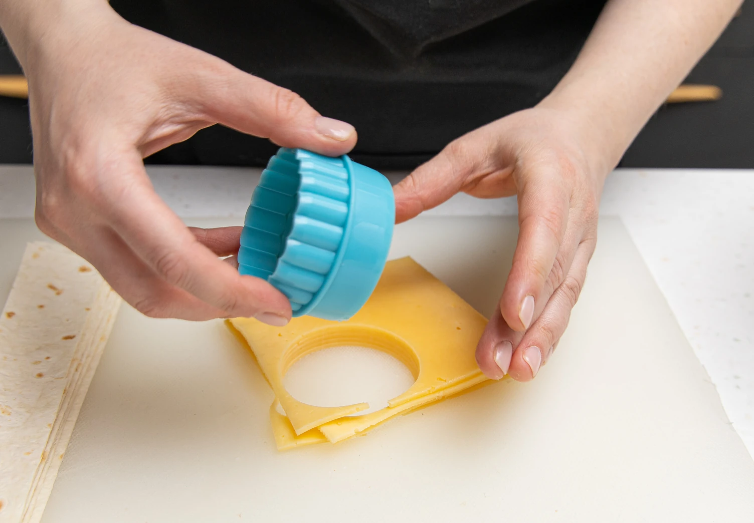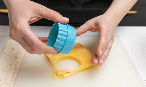 Из ломтиков сыра вырежьте точно такие по размеру кружки, как ломтики колбасы.