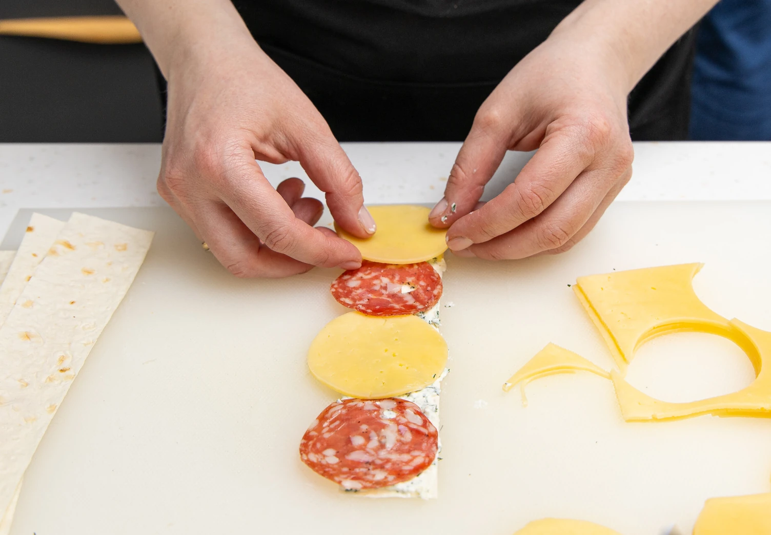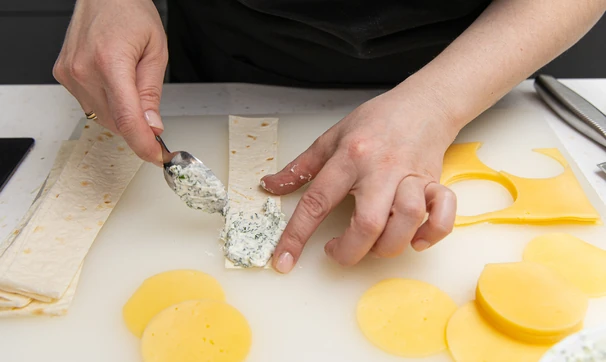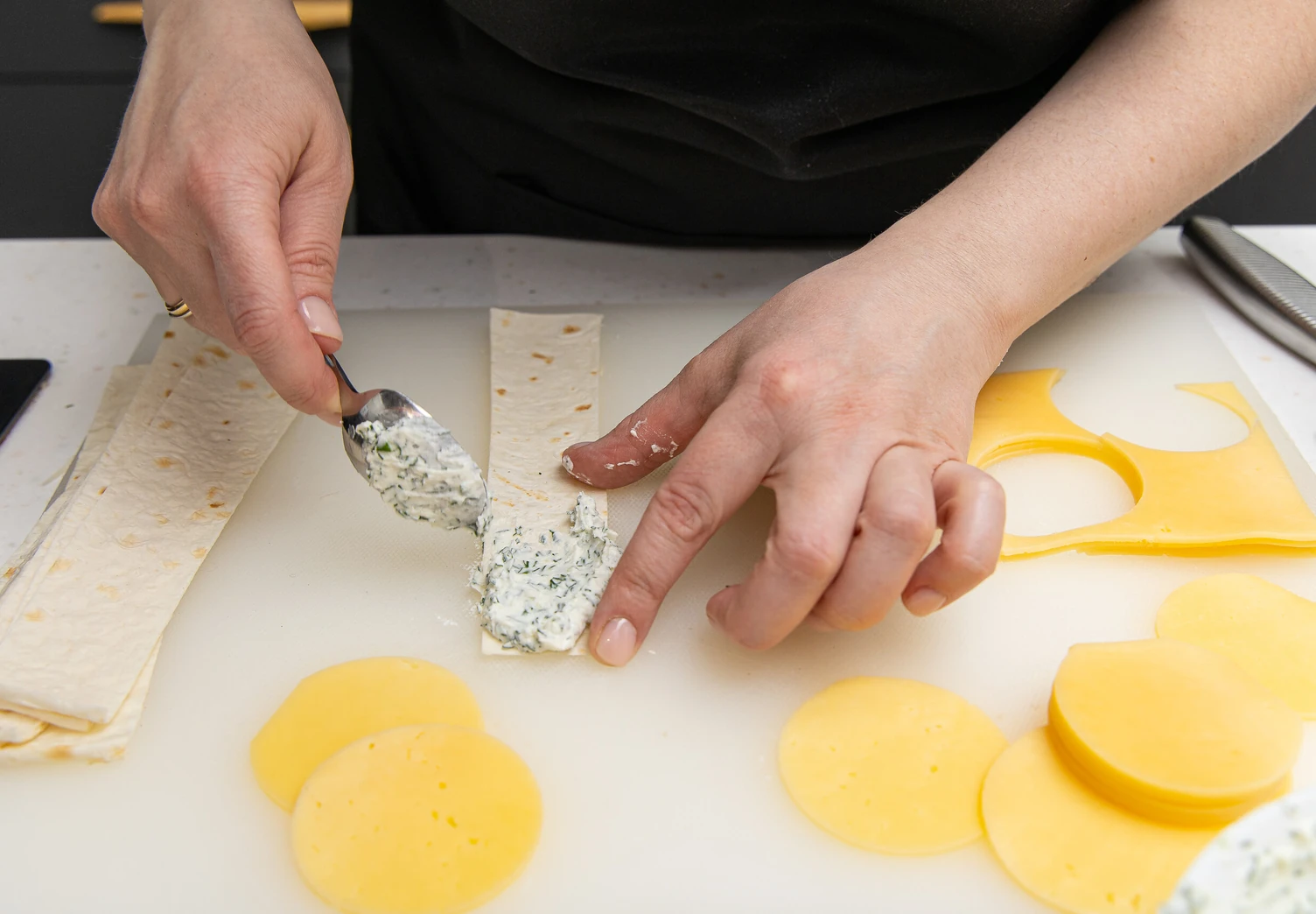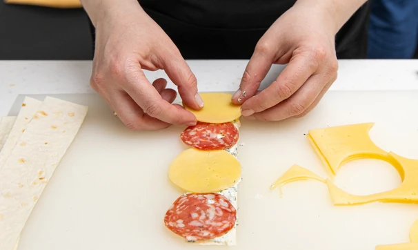 Рецепт «Рулетики с копчёной колбасой и сыром»