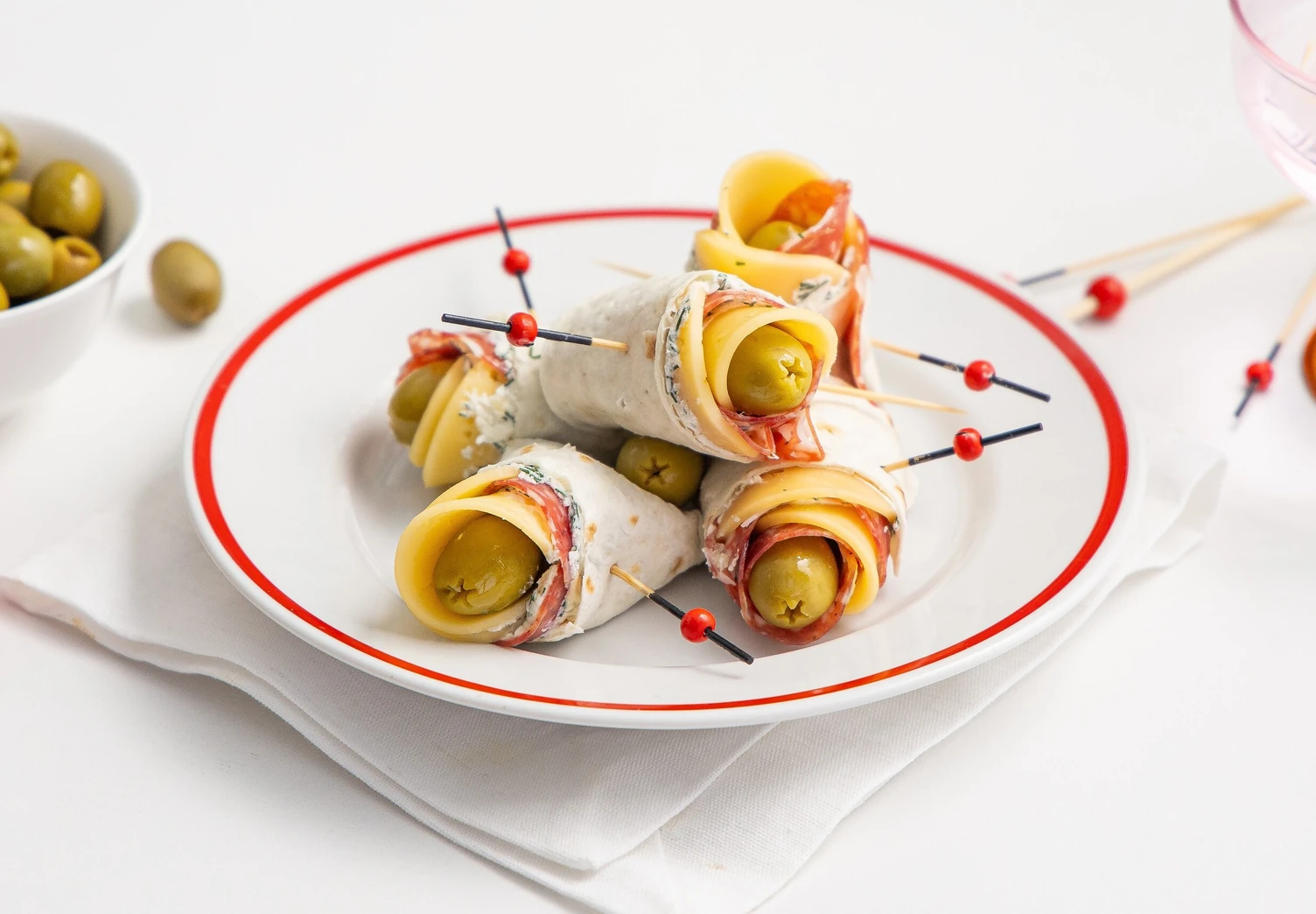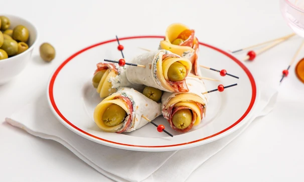С краю на лаваш выложите маслину или оливку и начните сворачивать полоску трубочкой. Проткните рулетик поперёк шпажкой. Так приготовьте все рулетики, пока не закончатся ингредиенты.