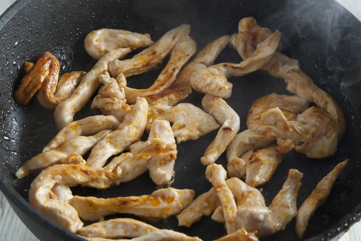 Куриное филе и болгарский перец нарежьте продольными полосками.