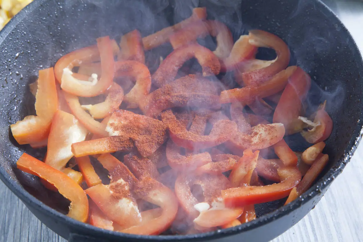 В оставшемся масле обжарьте болгарский перец, сразу всыпьте соль и специи.