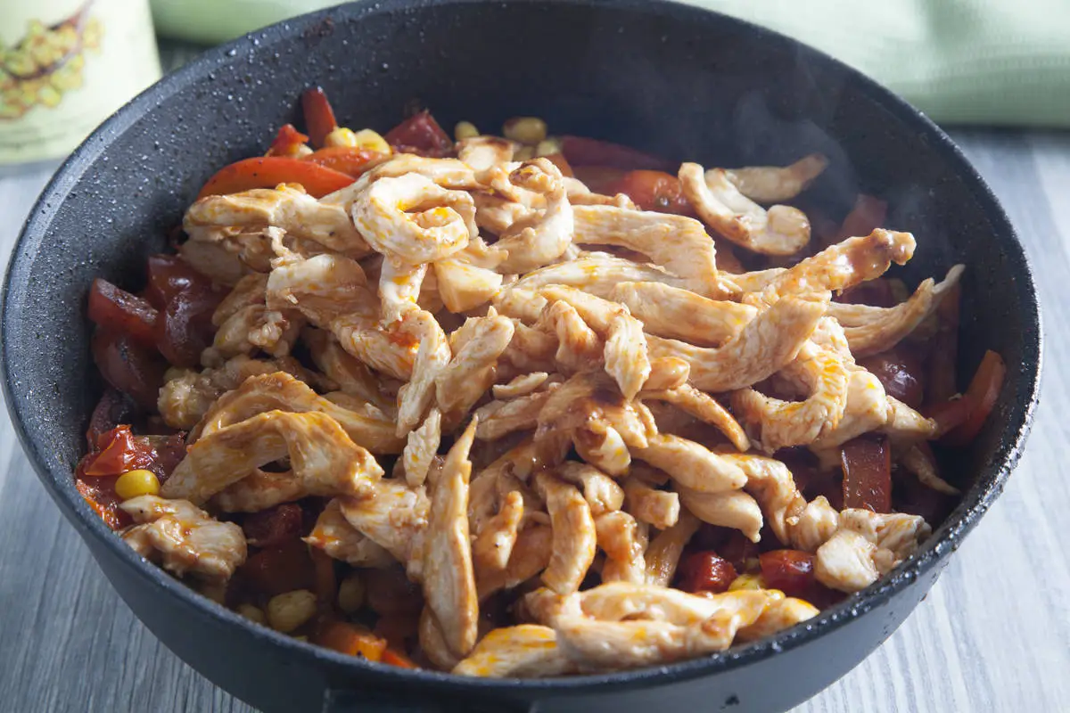 Откройте банку кукурузы, слейте жидкость, томаты порежьте кусочками, выложите все в сковороду к перцу, добавьте обжаренную курицу, все перемешайте и прогрейте минуту-две.