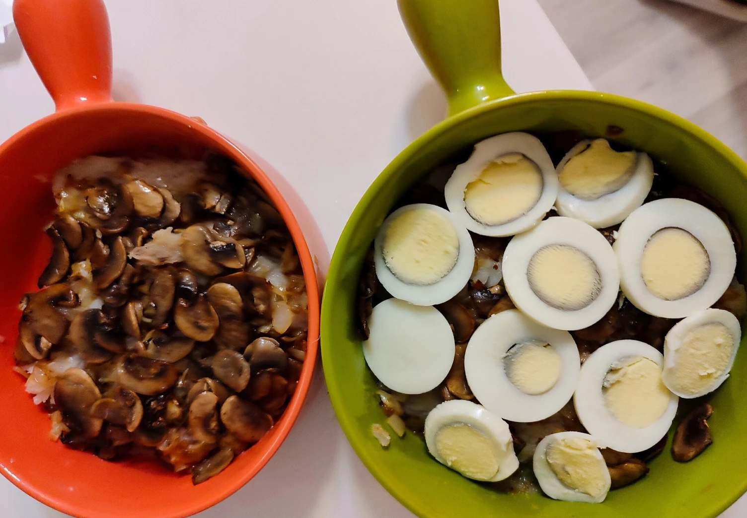 Выложите в форму слоями: рыбу, лук, грибы, яйца, картофель.