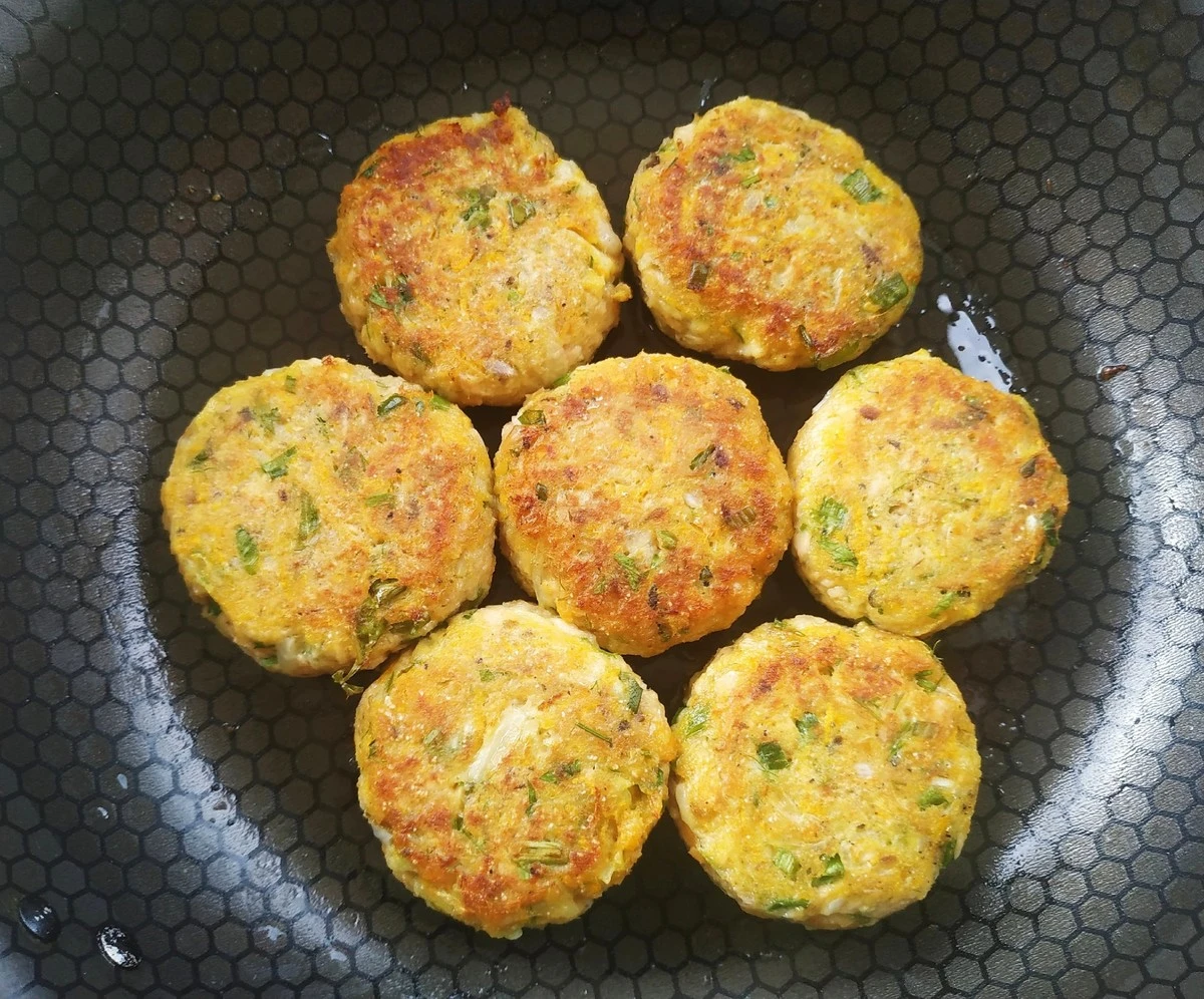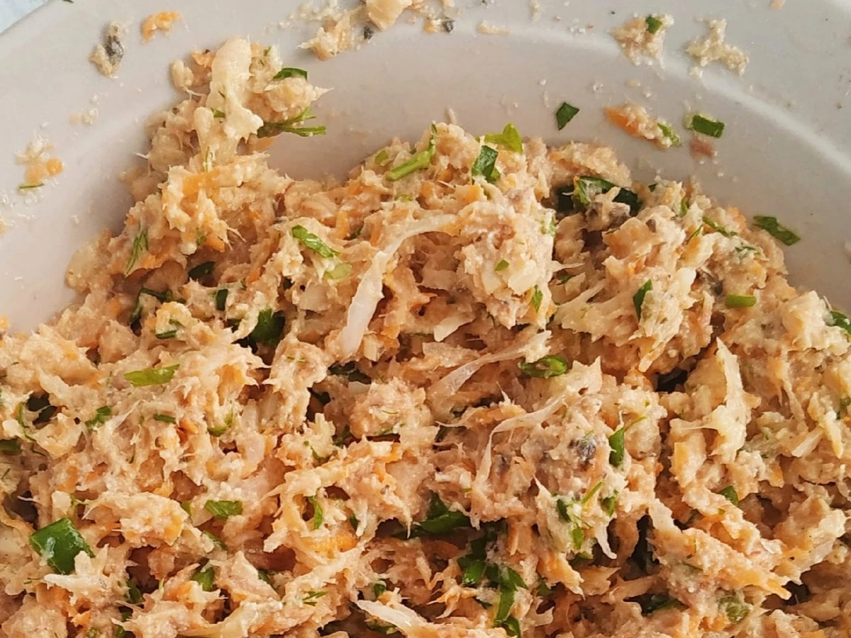 Добавьте к овощам рыбу и остальные ингредиенты, перемешайте и сформуйте котлеты.