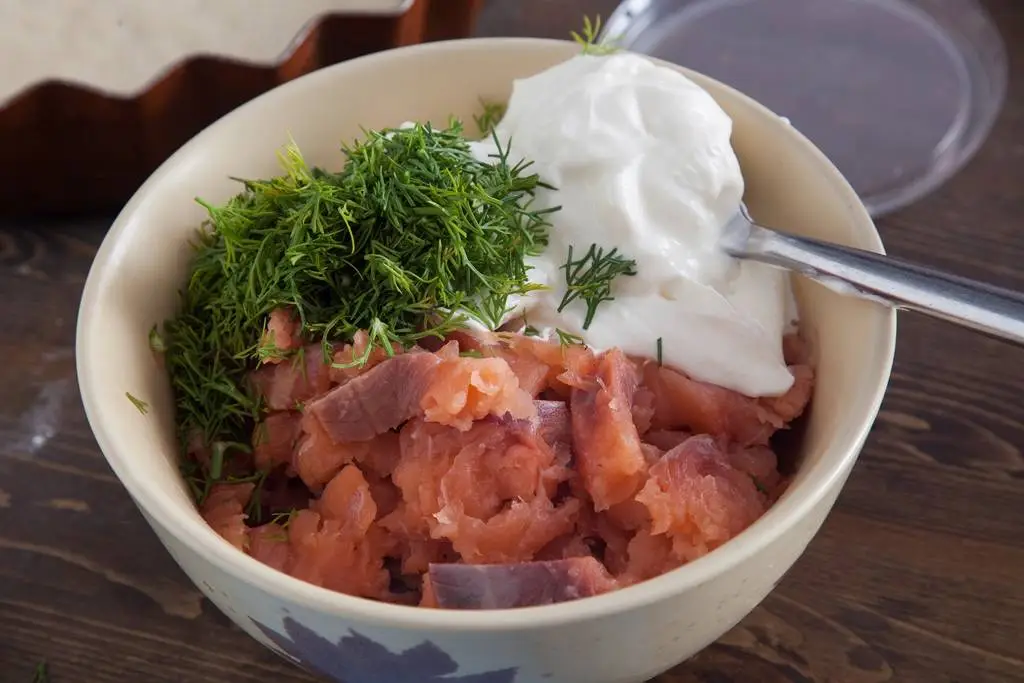 Рыбу смешайте со сметаной и нарезанным укропом, посолите, выложите на тесто.