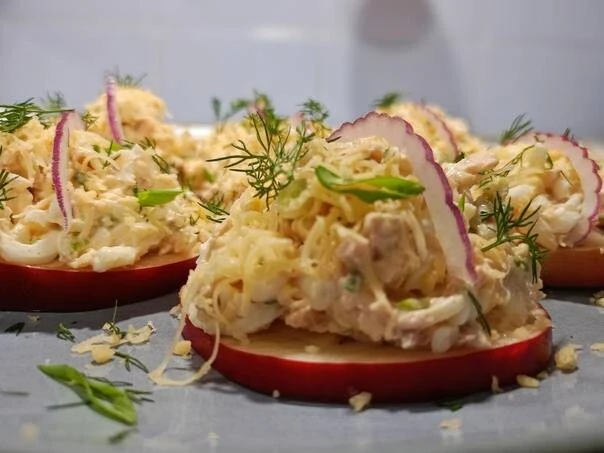 Выложите салат на каждый кусочек яблока и подавайте порционно.