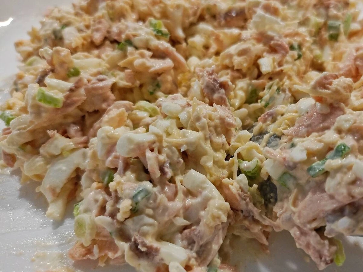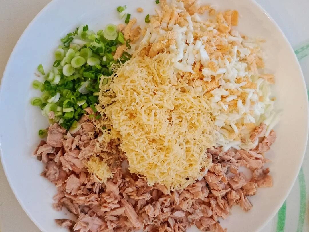 Смешайте ингредиенты, добавьте соль, перец и заправьте майонезом.
