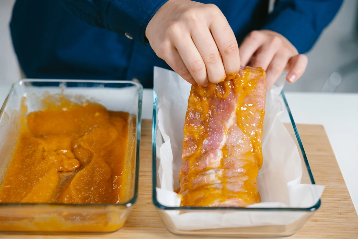 Разогрейте духовку до 200 °C. Замаринованные рёбра выложите на противень, предварительно застеленный пергаментом, и отправьте в духовку на 20 минут.