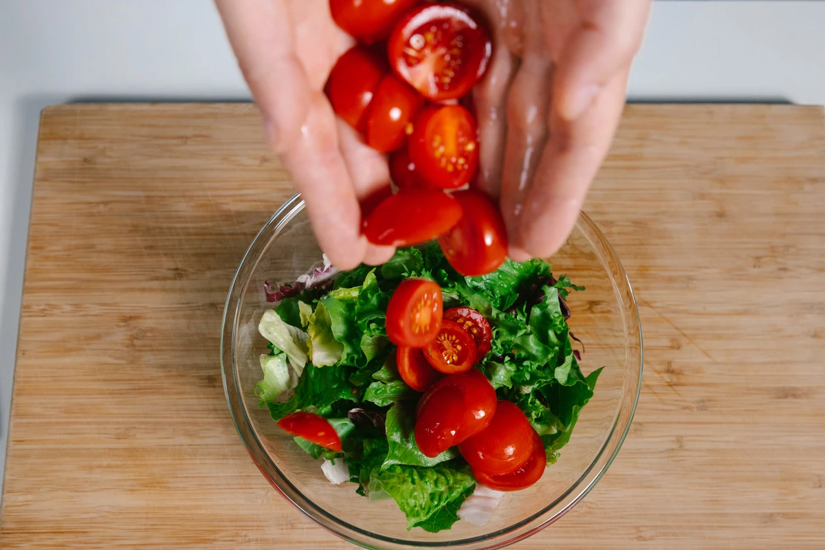 Пока рёбра запекаются, приготовьте салат. Вымойте помидоры и зелень, просушите. Черри разрежьте пополам, смешайте с зеленью.