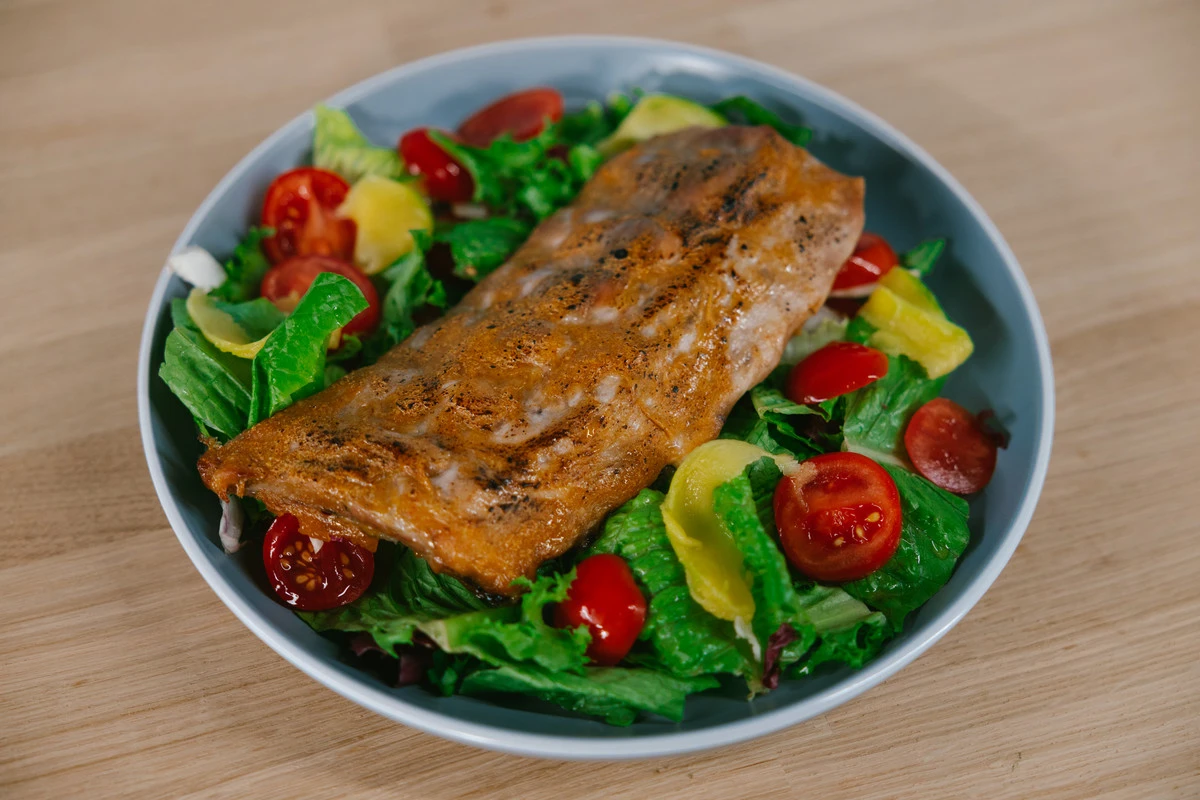 При подаче выложите рёбра на подушку из зелени и томатов.