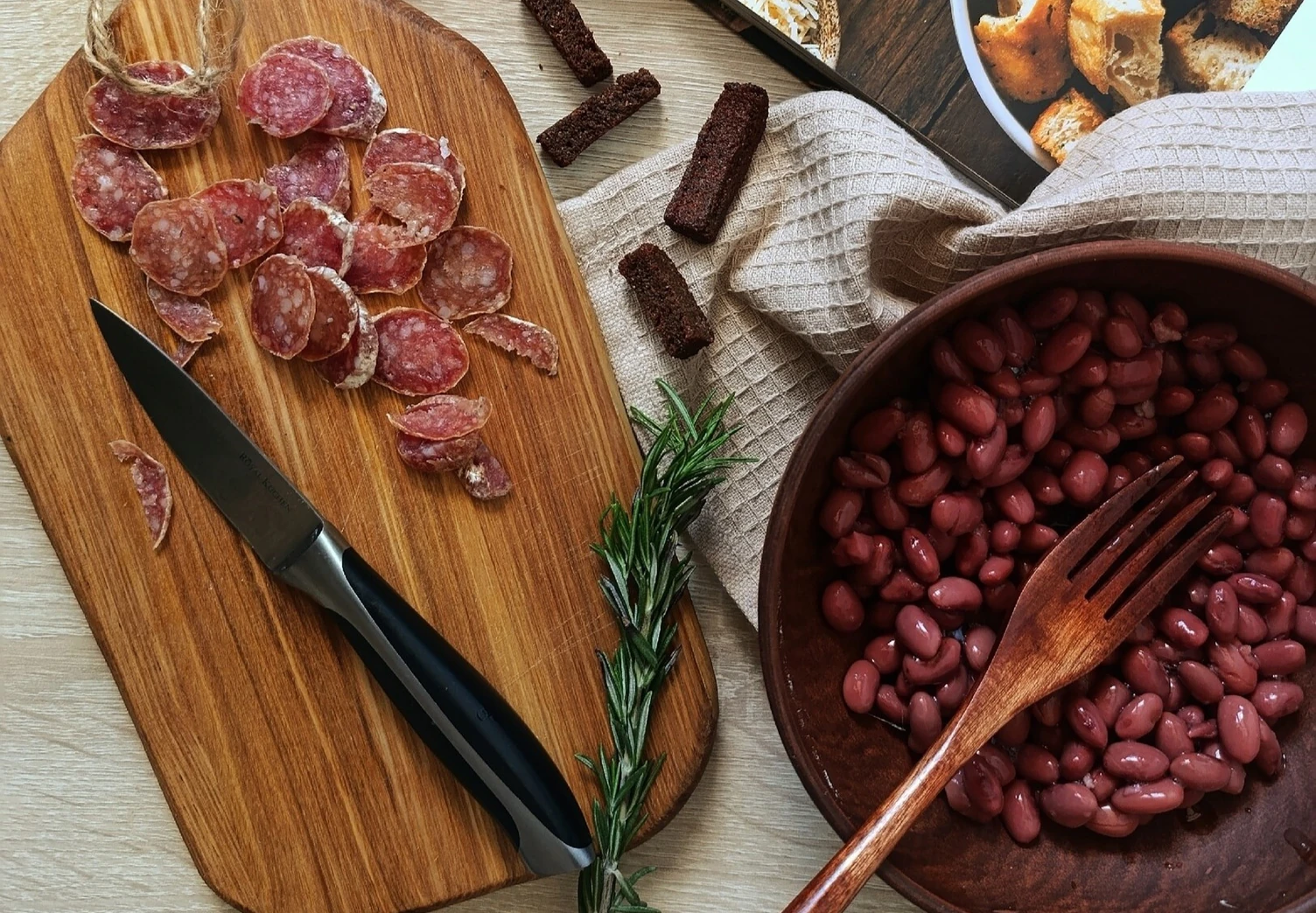 Фасоль откиньте на сито и промойте. Добавьте фасоль к колбасе.