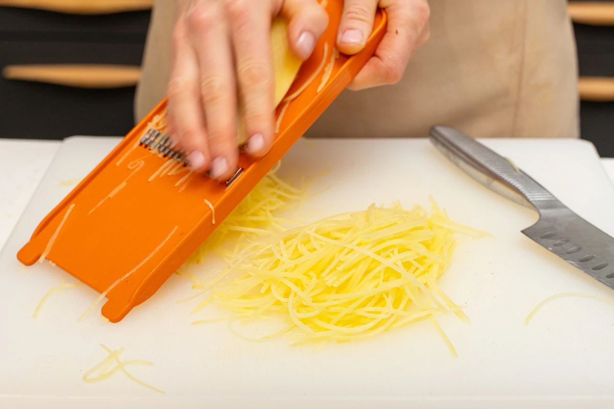 Одну сырую картофелину измельчите на тёрке для корейской моркови.