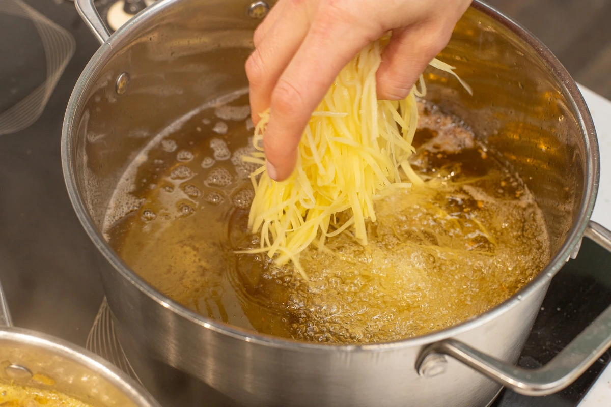 Хорошо разогрейте растительное масло в кастрюле, аккуратно опустите в него тёртый картофель и готовьте 5-7 минут, пока стружка не станет хрустящей. Выложите на бумажное полотенце, чтобы впиталось лишнее масло.