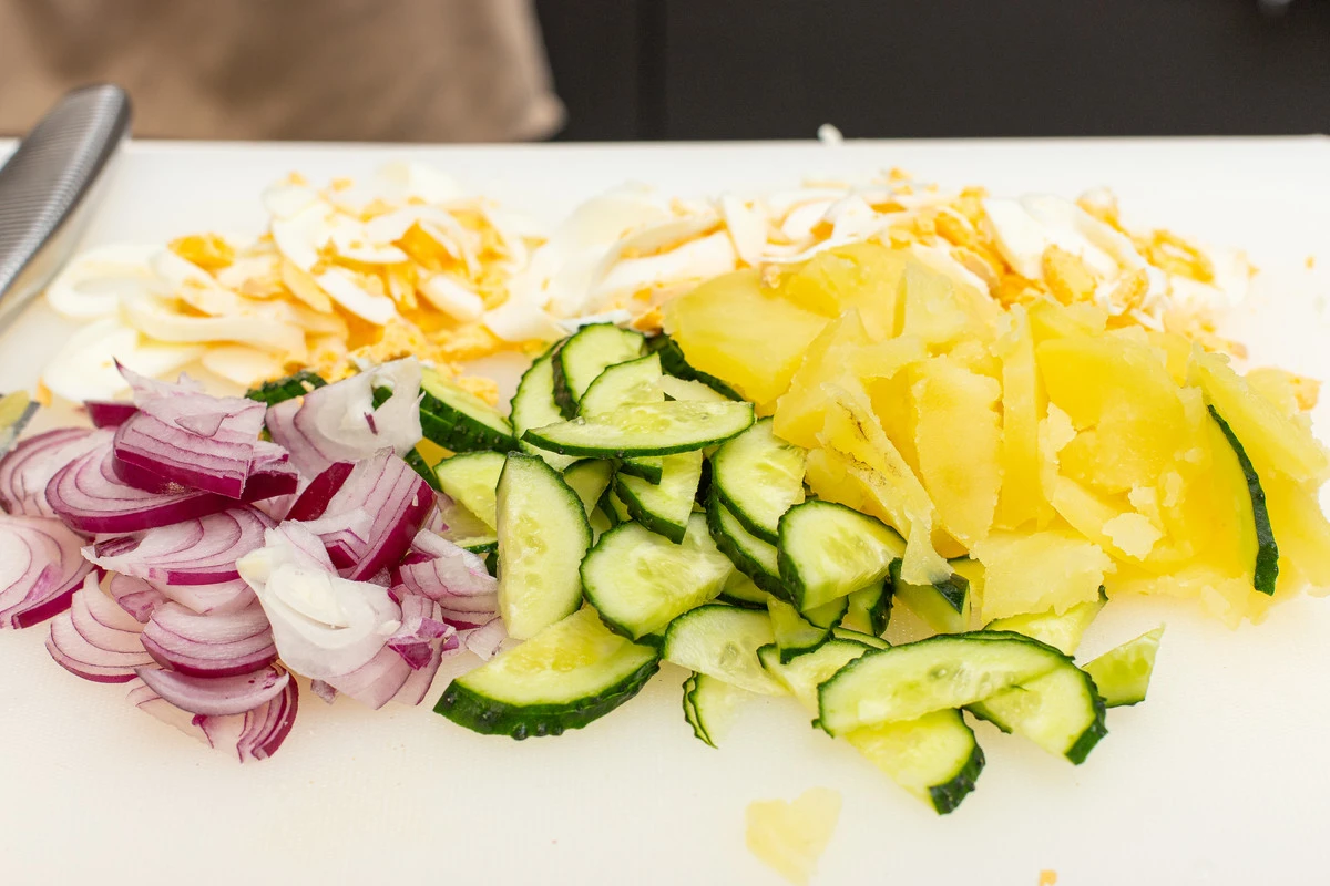Огурец и куриные яйца разрежьте вдоль пополам, а затем ломтиками. Картофель нарежьте кусочками такого же размера, как огурцы и яйца.
