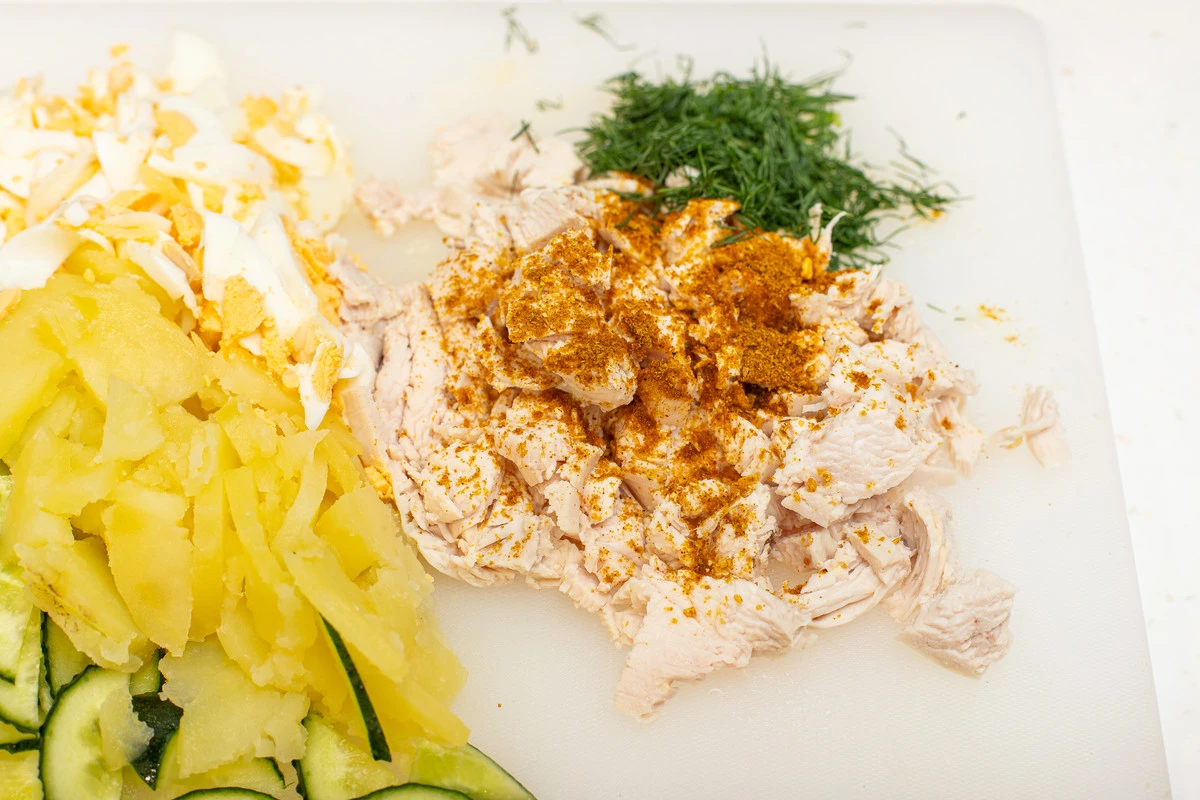 Куриное филе нарежьте кусочками такого же размера, как остальные ингредиенты, посыпьте специями для курицы и перемешайте. Мелко нарежьте укроп.