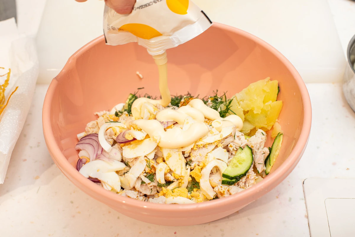 Сложите варёный картофель, яйца, огурцы, лук, курицу и укроп в миску. Добавьте 200-250 г майонеза или по вкусу, поперчите, при необходимости посолите и перемешайте.