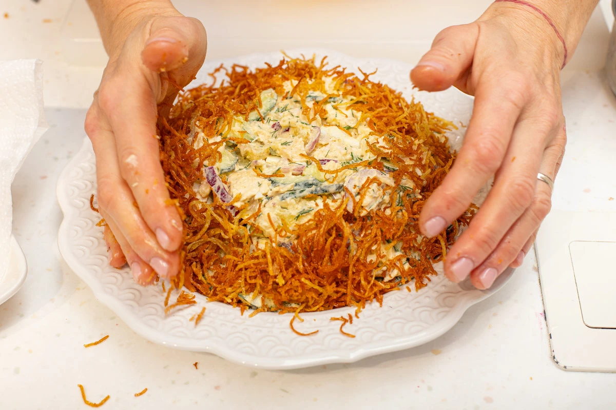 Украсьте картофельной стружкой и перепелиными яйцами (одно-два для красоты можете разрезать). Также перед тем как положить перепелиные яйца, можете посыпать верхнюю часть салата рубленой зеленью.
