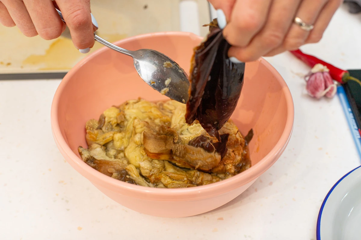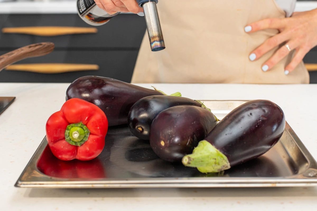 Баклажаны и перцы целиком запеките в духовке при 200 °C до мягкости и почернения кожицы. Перцы будут готовы через 20 минут, баклажанам понадобится около 30 минут. Также можно подпечь овощи на углях. Или перед запеканием опалить кожицы огнём газовой горелки для аромата (мы, кстати, поступили именно так).