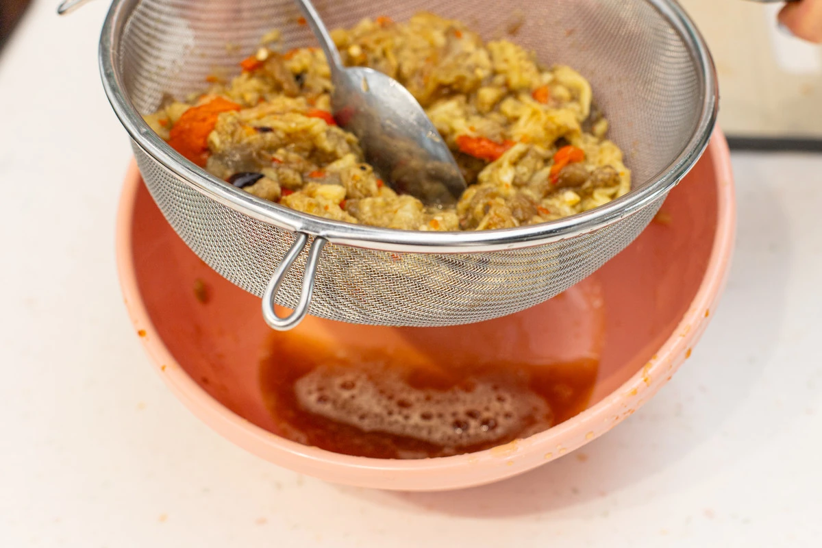 Мякоть овощей разомните вилкой, переложите в сито и слейте лишнюю жидкость. На этом этапе можно перемолоть овощи в блендере или оставить кусочками, нам больше нравится второй вариант.