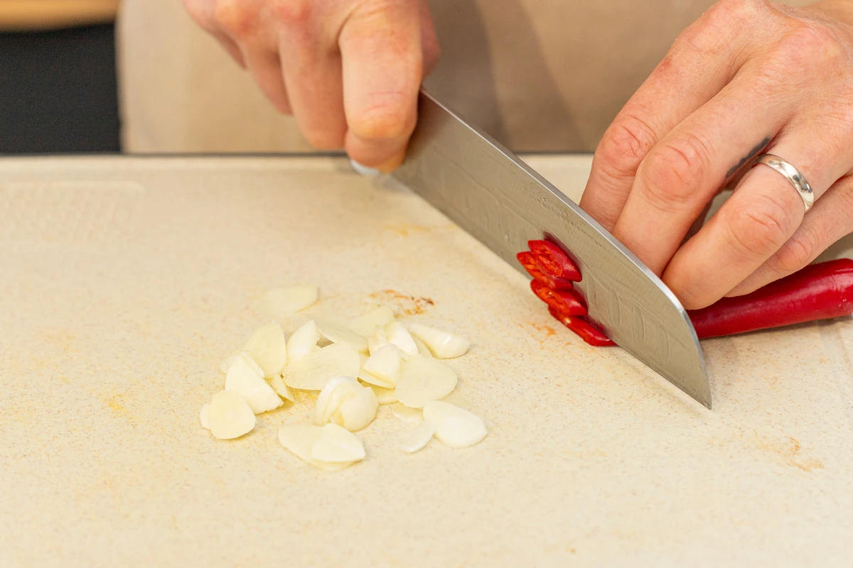 Чеснок нарежьте тонкими пластинками, отрежьте несколько колечек острого перца, зелень измельчите.