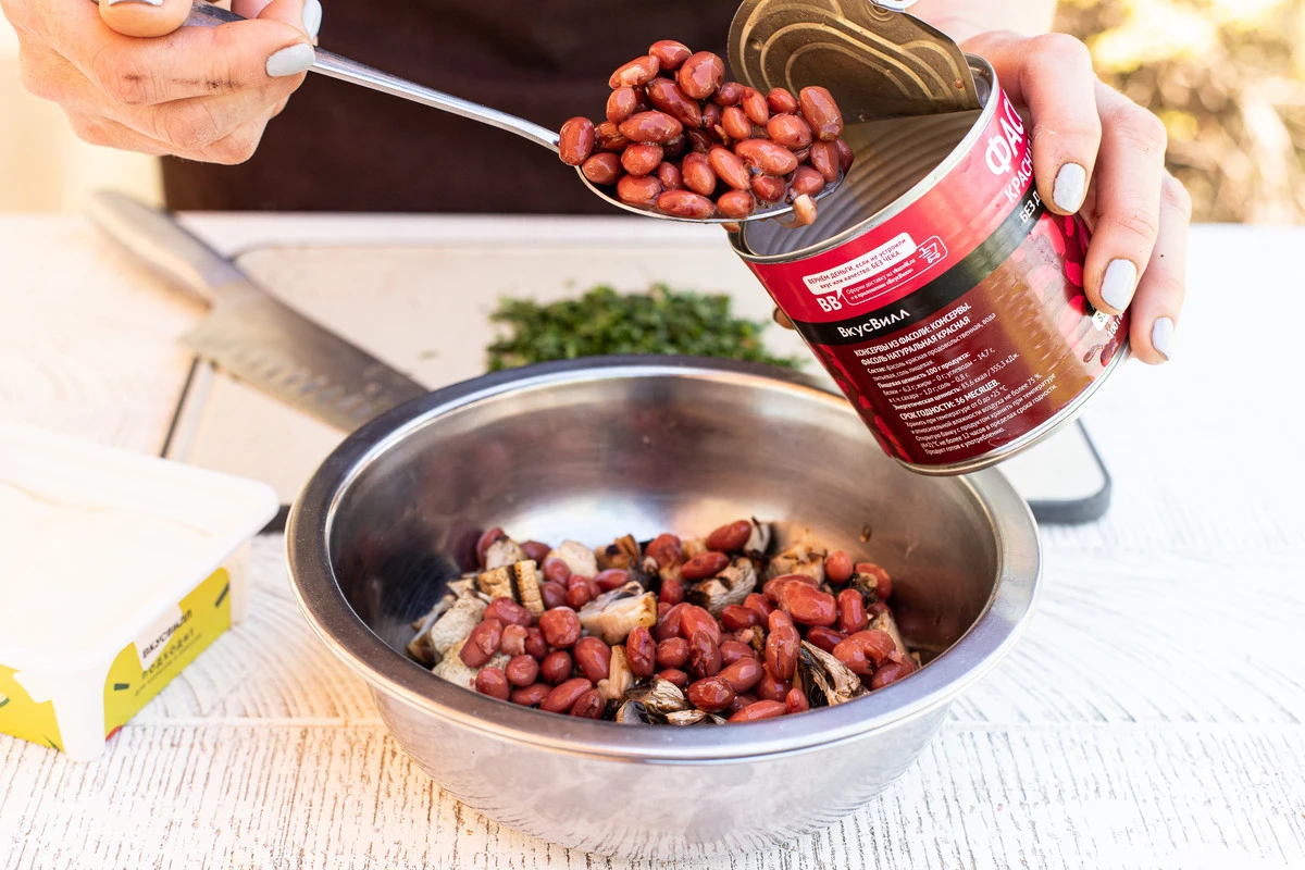 Добавьте фасоль (без жидкости) и измельчённую петрушку.