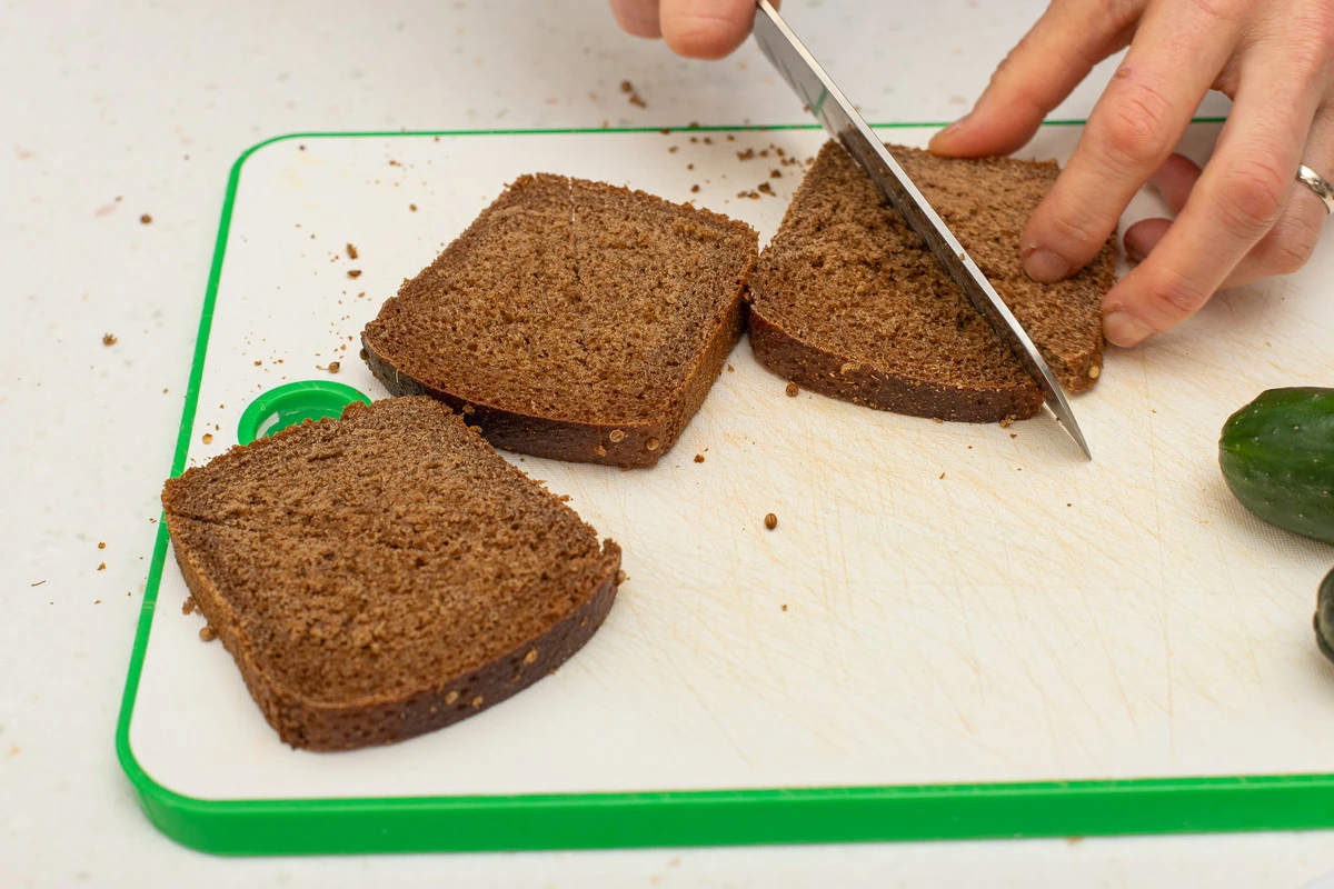 Хлеб нарежьте треугольными ломтиками, сбрызните маслом и подсушите в духовке или на сковороде.