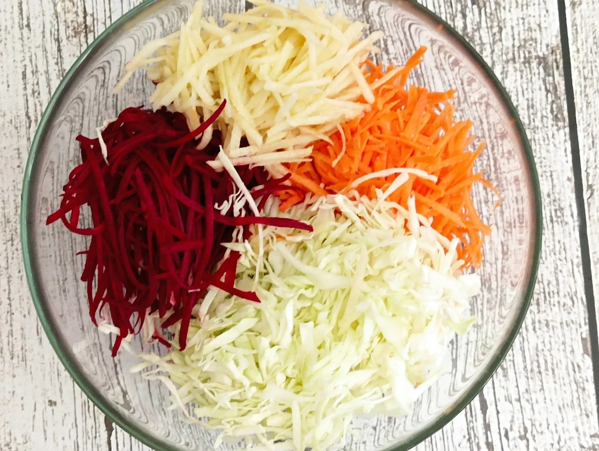 Нашинкуйте любым удобным способом овощи и фрукты.