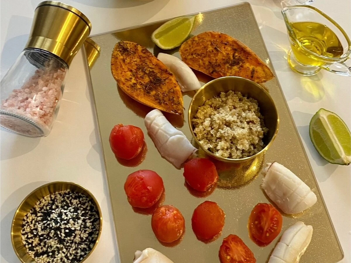 Выложите на тарелку шпинат, киноа, томаты и запеченный батат. Сверху выложите кальмары. Полейте соевым соусом и оливковым маслом.