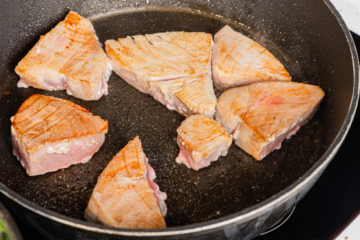 Заранее разморозьте филе тунца и отварите яйца вкрутую. Разогрейте сковороду с 2 ст. л. растительного масла, выложите кусочки филе тунца, обжарьте по 2-3 минуты с каждой стороны. Выложите на салфетку.