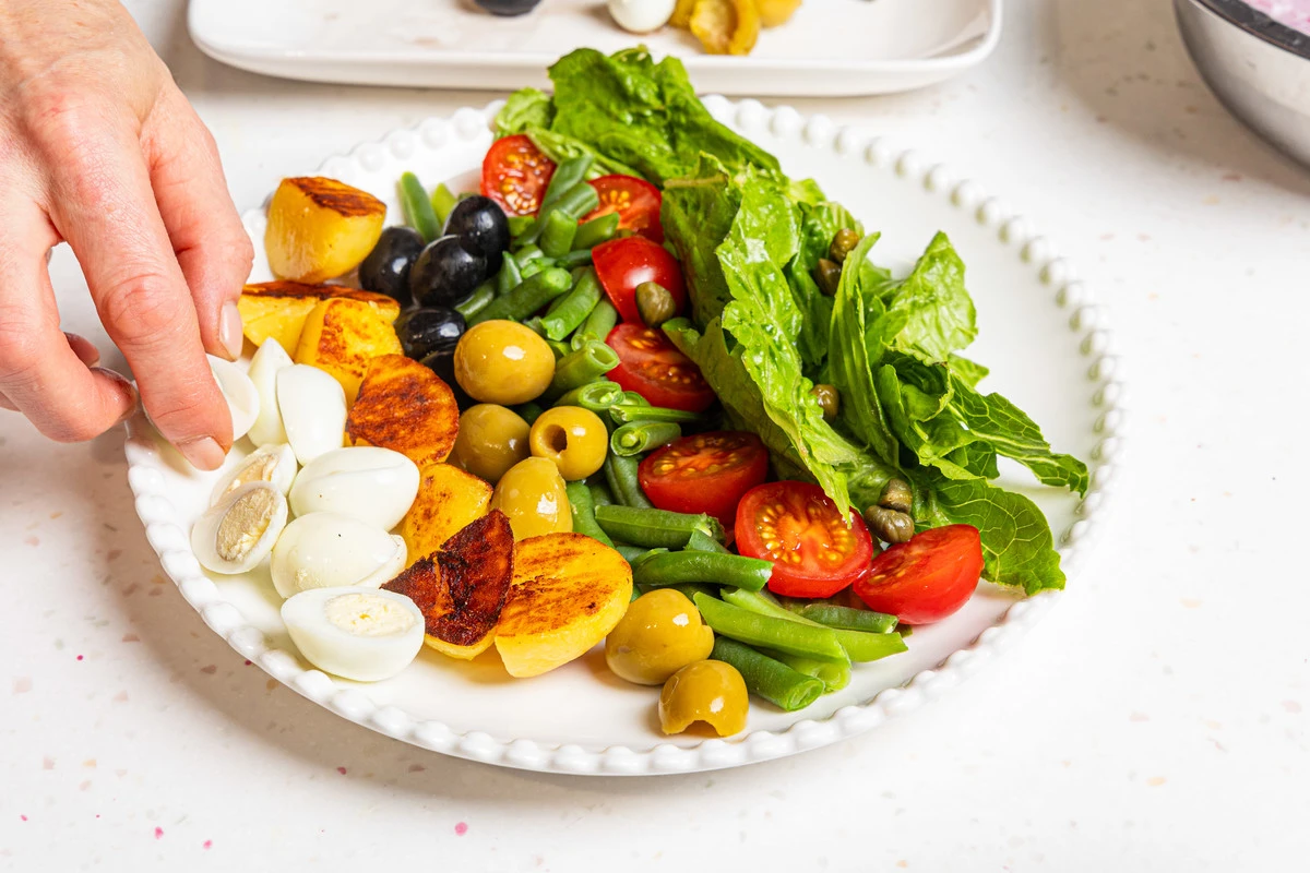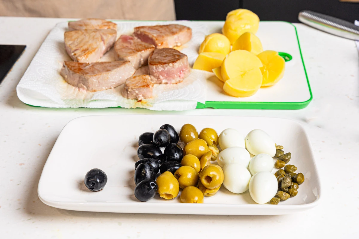Выложите на тарелку перепелиные яйца, картофель, оливки, маслины, фасоль, каперсы, черри, листья салата, ломтики редиса и ломтики тунца. Как вариант, можете выложить все ингредиенты на листья салата.