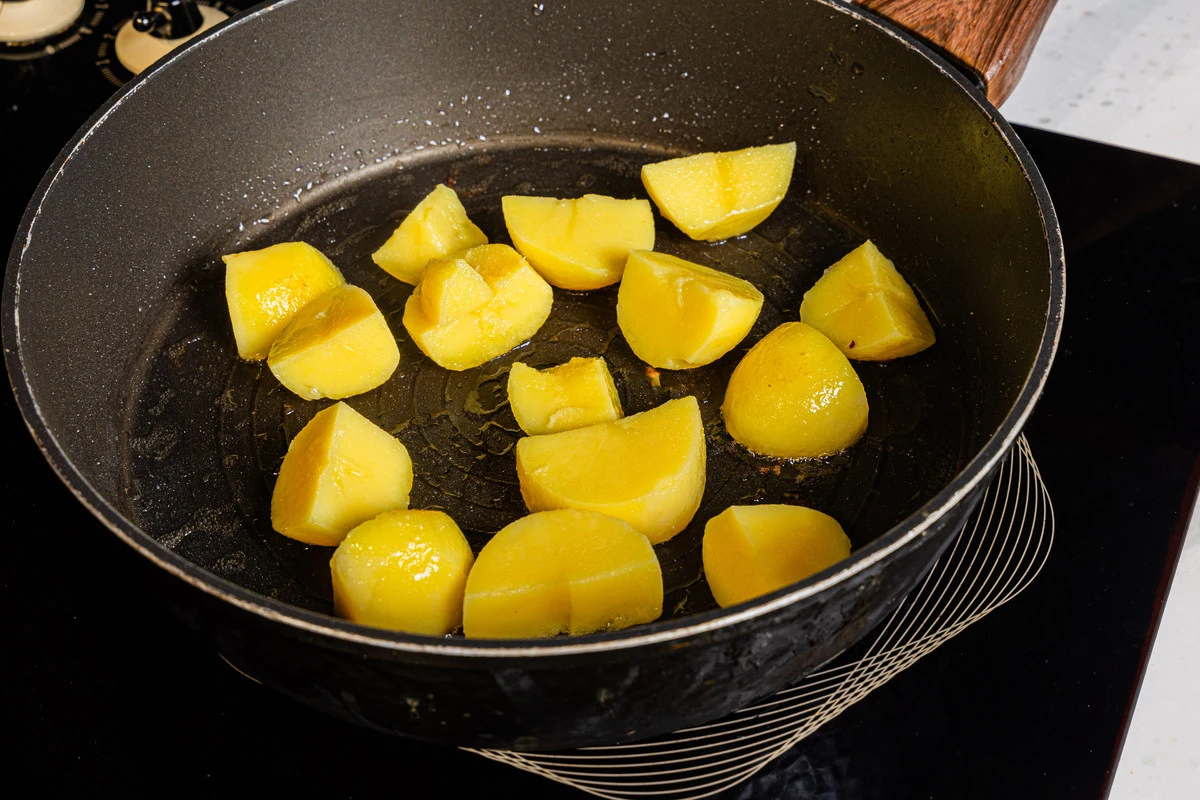 Разогрейте сковороду с 1-2 ст. л. растительного масла, выложите картофель и обжаривайте до золотистого цвета 5-10 минут.