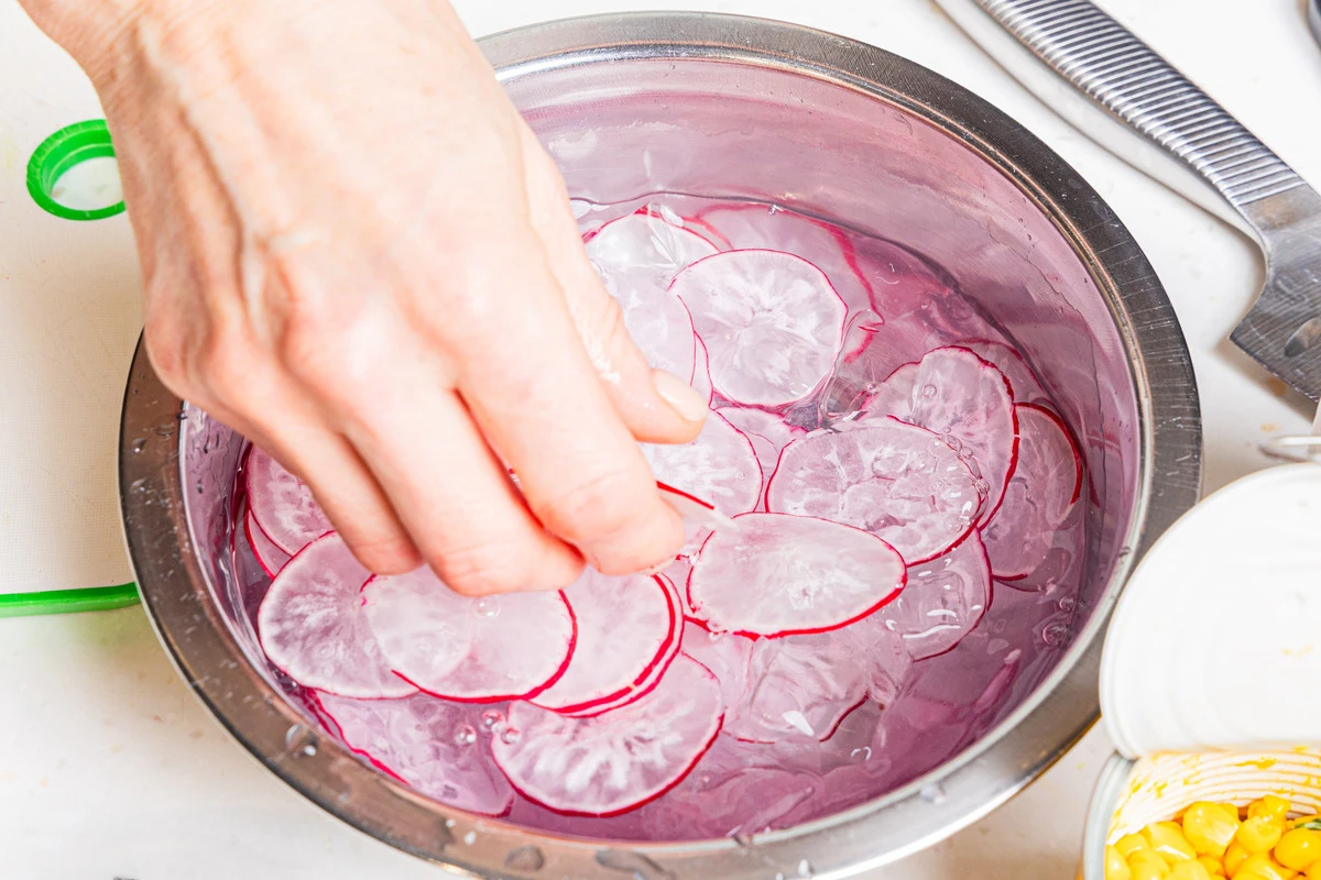 Редис нарежьте тонкими ломтиками с помощью тёрки или ломтерезки. Положите в миску с водой и льдом примерно на 5-7 минут, чтобы ушла горечь, а ломтики стали упругими.