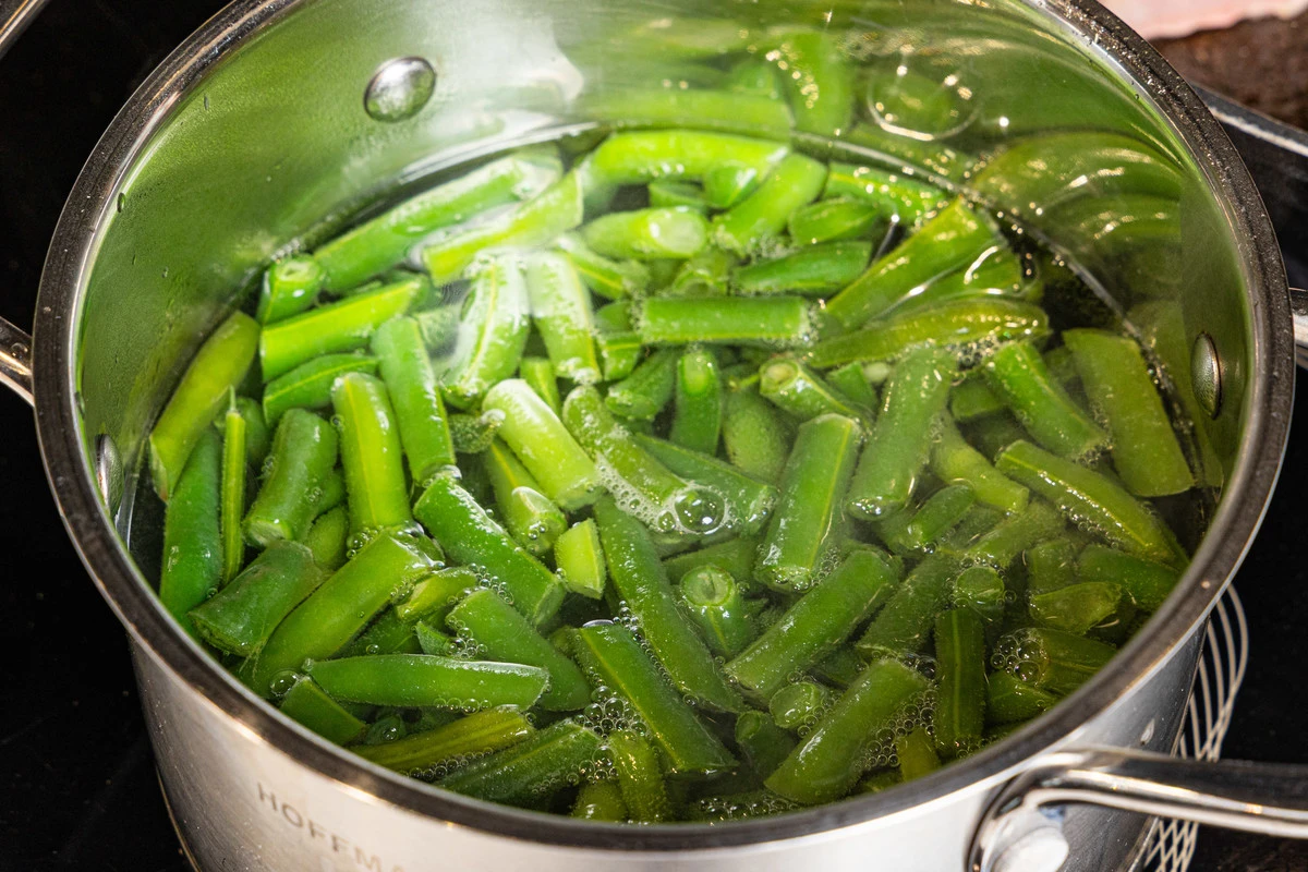Фасоль опустите в подсоленную кипящую воду и варите 3-5 минут. Затем сразу же слейте воду, чтобы не переварить.