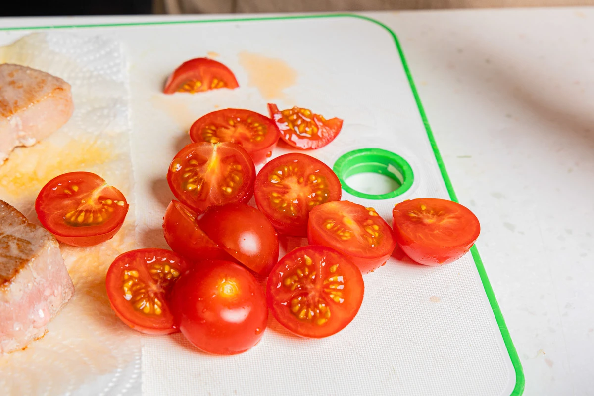 Помидоры черри разрежьте на половинки. Листья салата хорошо промойте, обсушите и порвите руками.