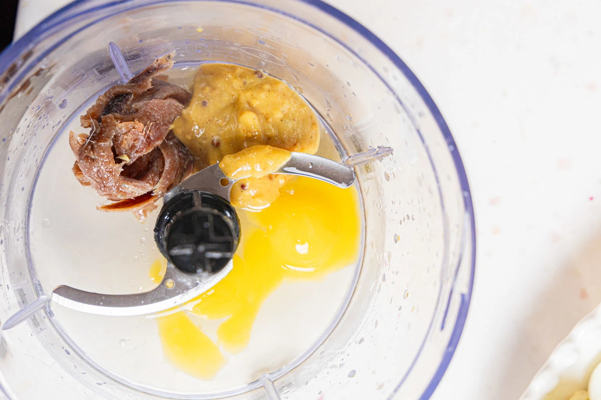 Сделайте заправку. Для этого смешайте блендером до однородности анчоусы, 2 сырых перепелиных яйца, дижонскую горчицу, оливковое масло, сок лимона, бальзамик (по желанию) и сахар. Полейте получившейся заправкой салат и подавайте.