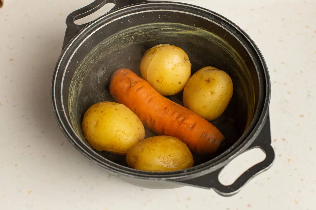 Картофель, морковь и яйца, отварите. Слейте воду и остудите овощи и яйца.