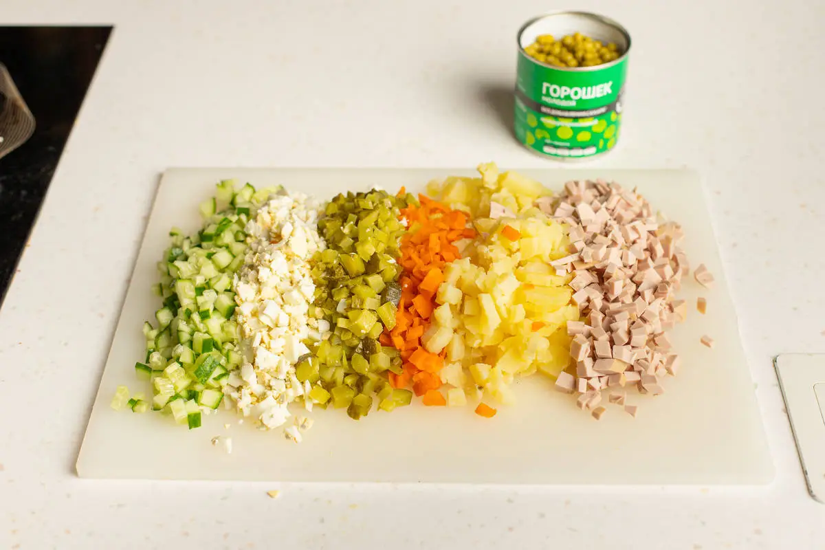 Нарежьте все ингредиенты кубиками, размер кубиков — такой же, как размер горошин. Правильная нарезка очень важна, в этом один из секретов вкуса правильного оливье. С зелёного горошка слейте жидкость.