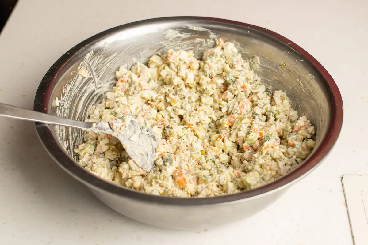 Салат оливье классический с колбасой