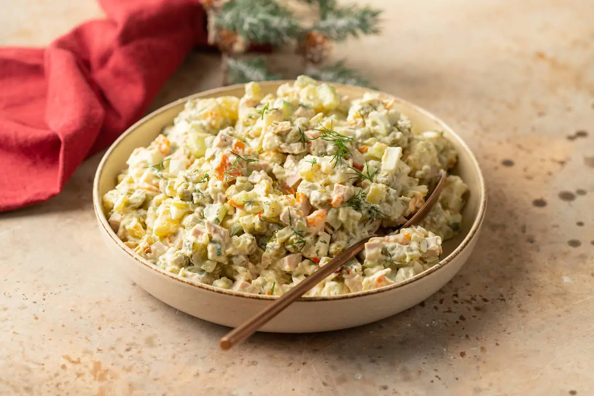 При подаче переложите оливье в салатник и посыпьте измельчённым укропом.