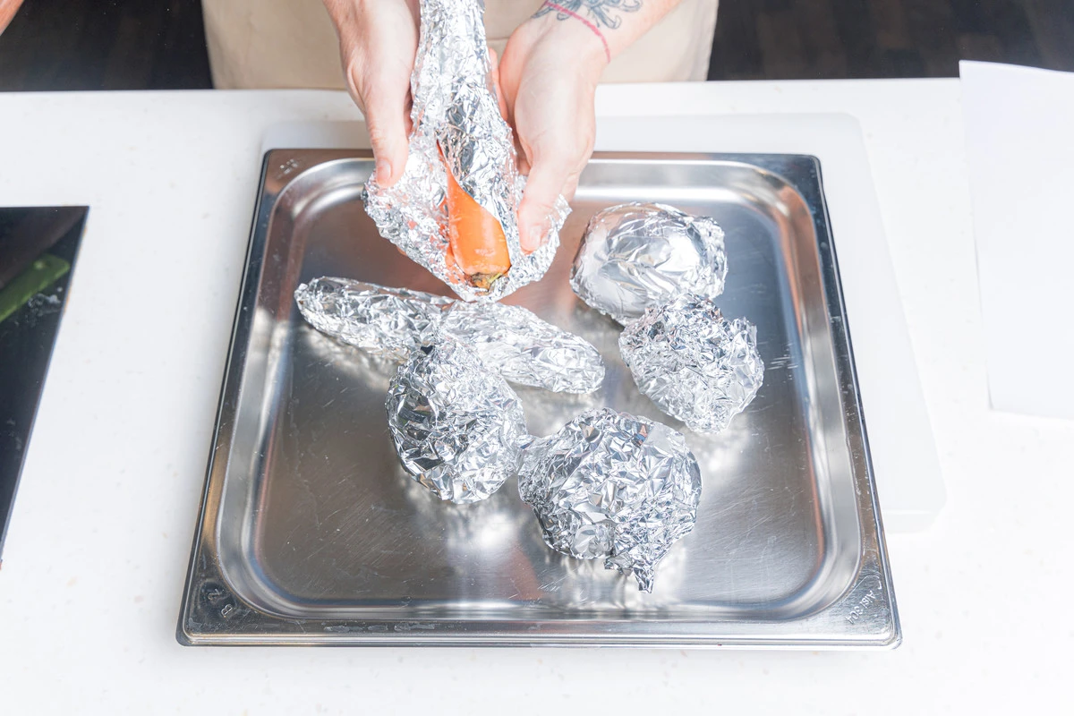 Положите овощи и курицу в фольге в духовку и запекайте при 180 °C до готовности. Через 30 минут после начала запекания проверьте готовность курицы и овощей — курицу надрежьте, овощи проткните ножом: если овощи готовы, нож будет легко входить и выходить. Если овощи сыроваты, снова заверните в фольгу и продолжайте запекать ещё минут 10. По готовности курицы и овощей достаньте их из духовки и остудите.