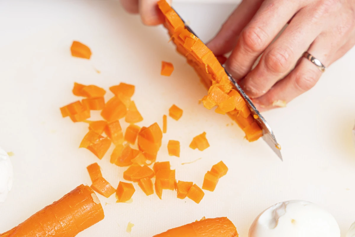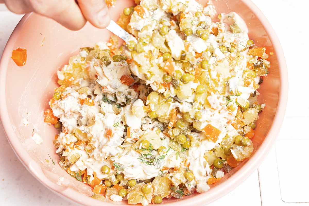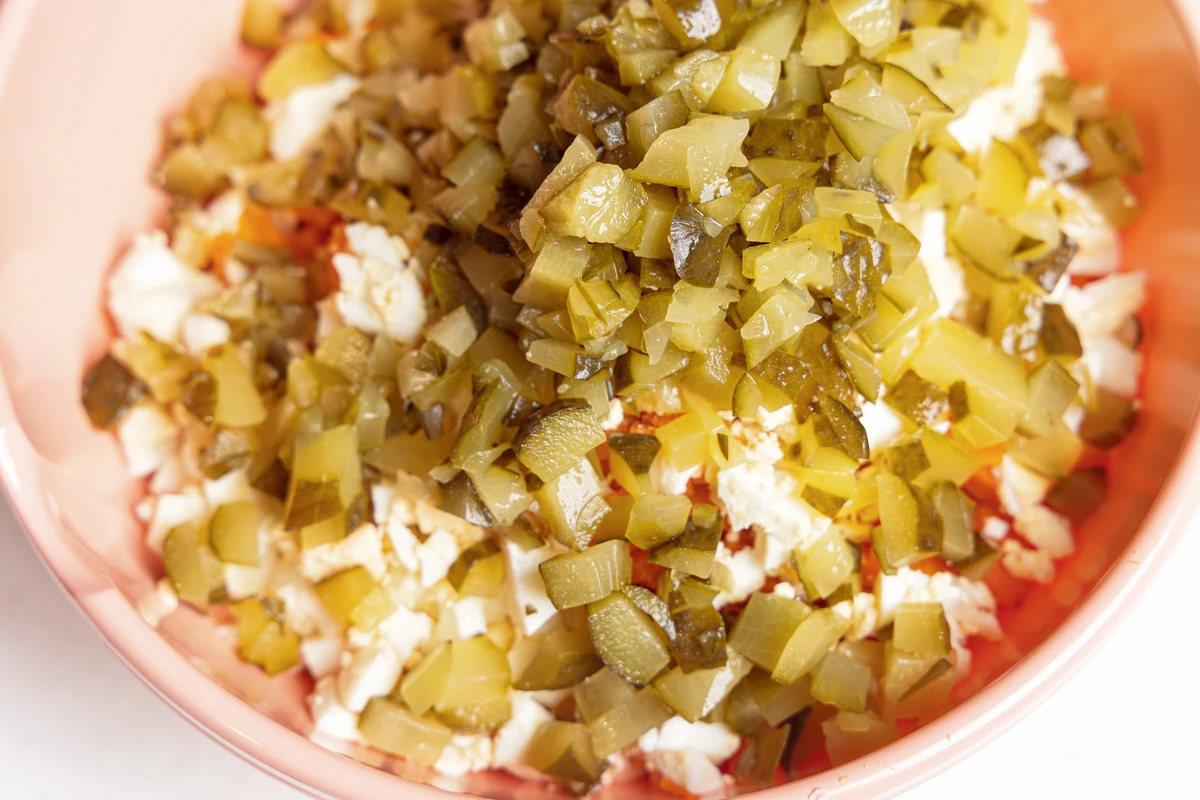 Нарежьте картофель, морковь, яйца и огурцы кубиками размером с зелёный горошек. Если огурцы толстокожие, почистите их перед нарезкой. По желанию можете положить не 4 огурца, а больше.