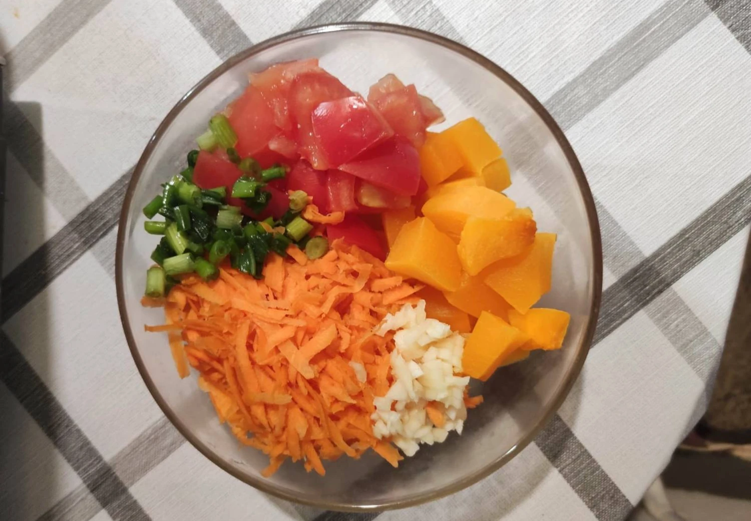 Приготовить тыкву любым удобным способом, остудить и нарезать на маленькие кубики. Небольшую морковь натереть на тёрке. Помидоры порезать на небольшие кусочки. Чеснок и зелёный лук мелко нарезать. Смешать все овощи в миске.