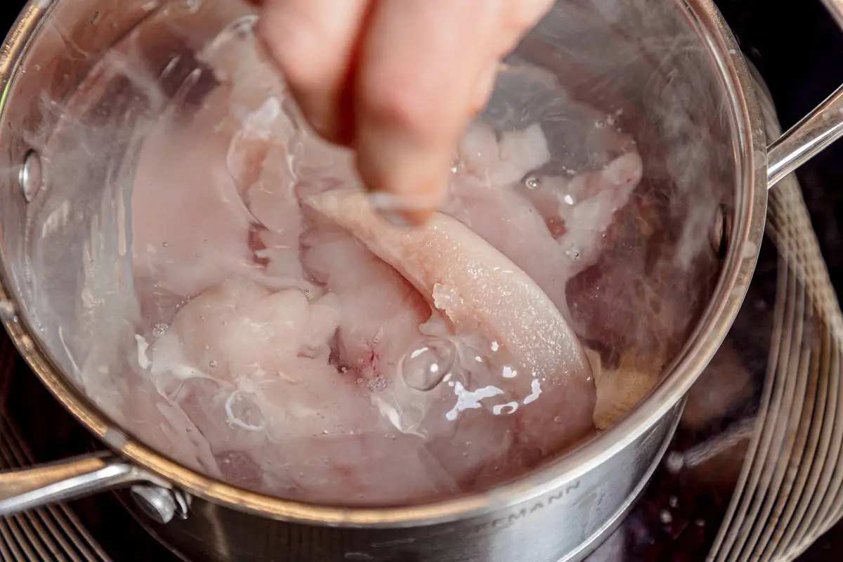 Вскипятите воду в сотейнике, подсолите, положите куриное филе. Доведите до кипения, варите 5 минут. Выключите огонь и оставьте филе в воде ещё на 15 минут под крышкой. Затем выньте готовое филе и остудите.