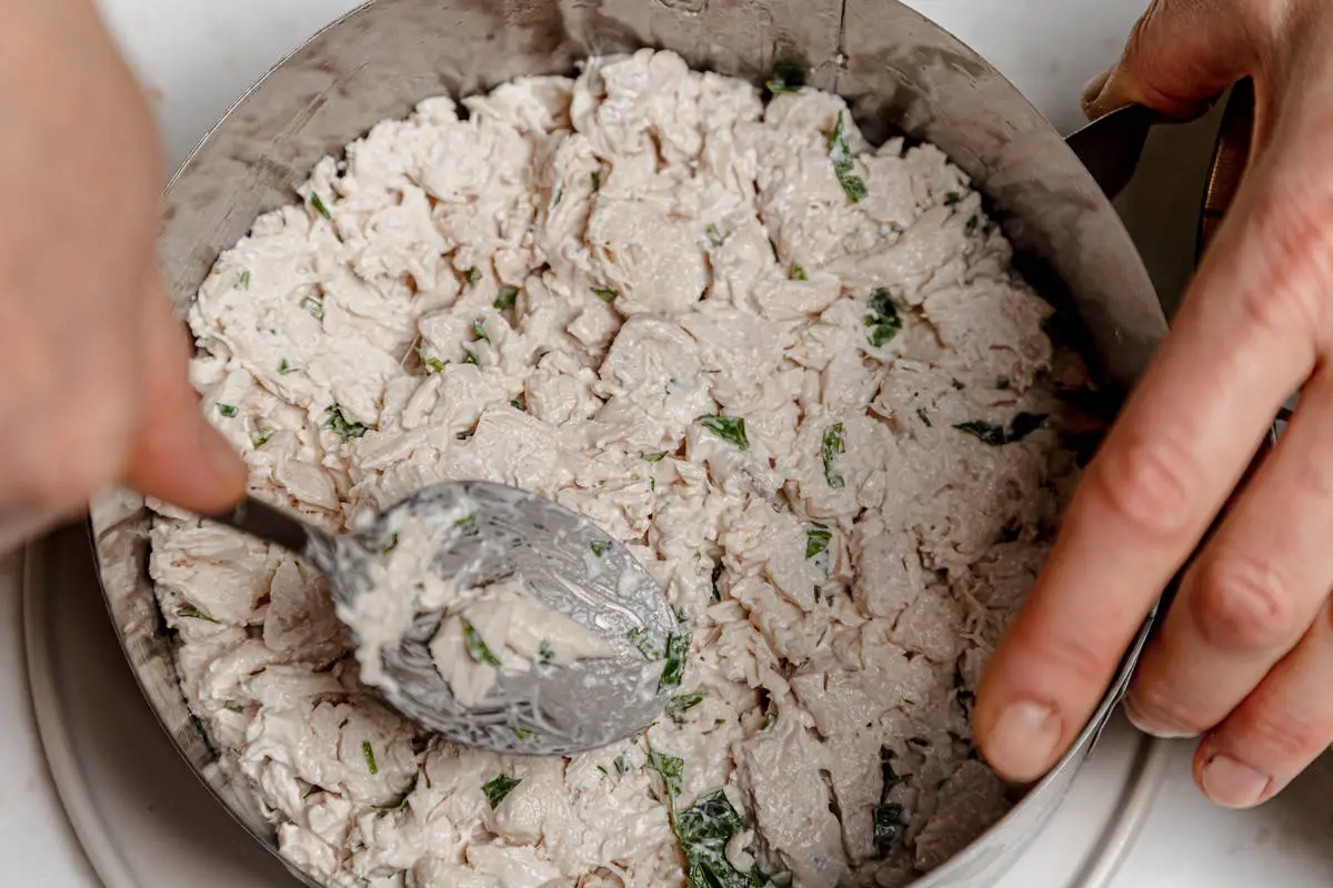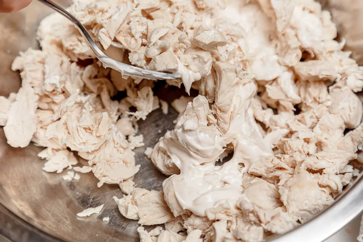 Остывшее филе нарежьте мелкими кусочками. Перемешайте куриное мясо с тремя столовыми ложками майонеза и рубленой петрушкой.